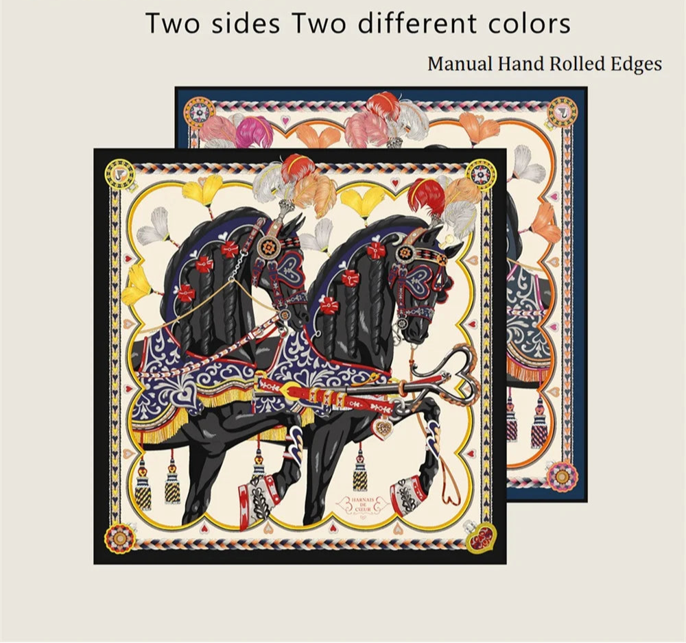 Wrap yourself in equestrian elegance with our Two-Sided Equestrian Scarf! This silky statement piece gallops between classic black, cream, blue and pinks creating a playful pattern that's sure to turn heads. Perfect for adding a splash of personality to any outfit.
