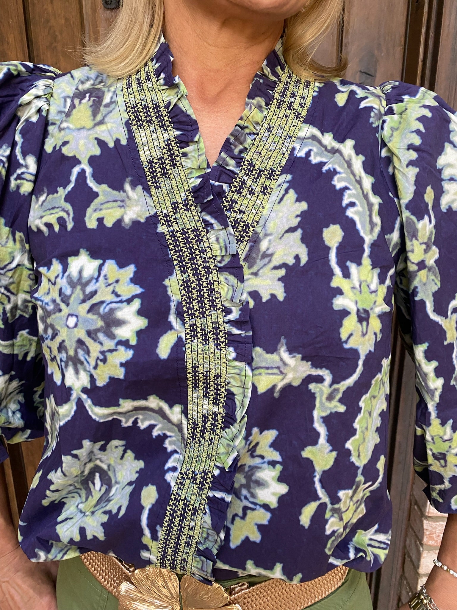 Add a splash of charm to your wardrobe with the Sadie Blouse. Featuring a rich sapphire blue base adorned with delicate sage flower prints, its playful V-neck and ruffle-front design offer a flirty, feminine touch. The long sleeves make it perfect for layering or wearing on cooler days while keeping you stylish and comfortable.