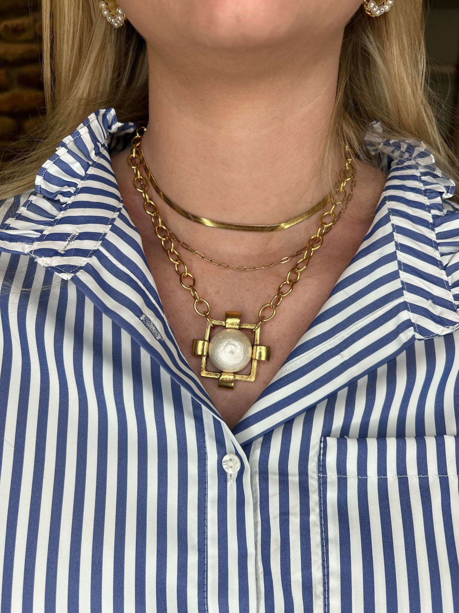 Indulge in luxury with our Brooklyn Pearl necklace. Handmade in the USA, this exquisite piece features a 22K gold-plated link chain adorned with a stunning statement pearl. Elevate your style with this classy and exclusive accessory.