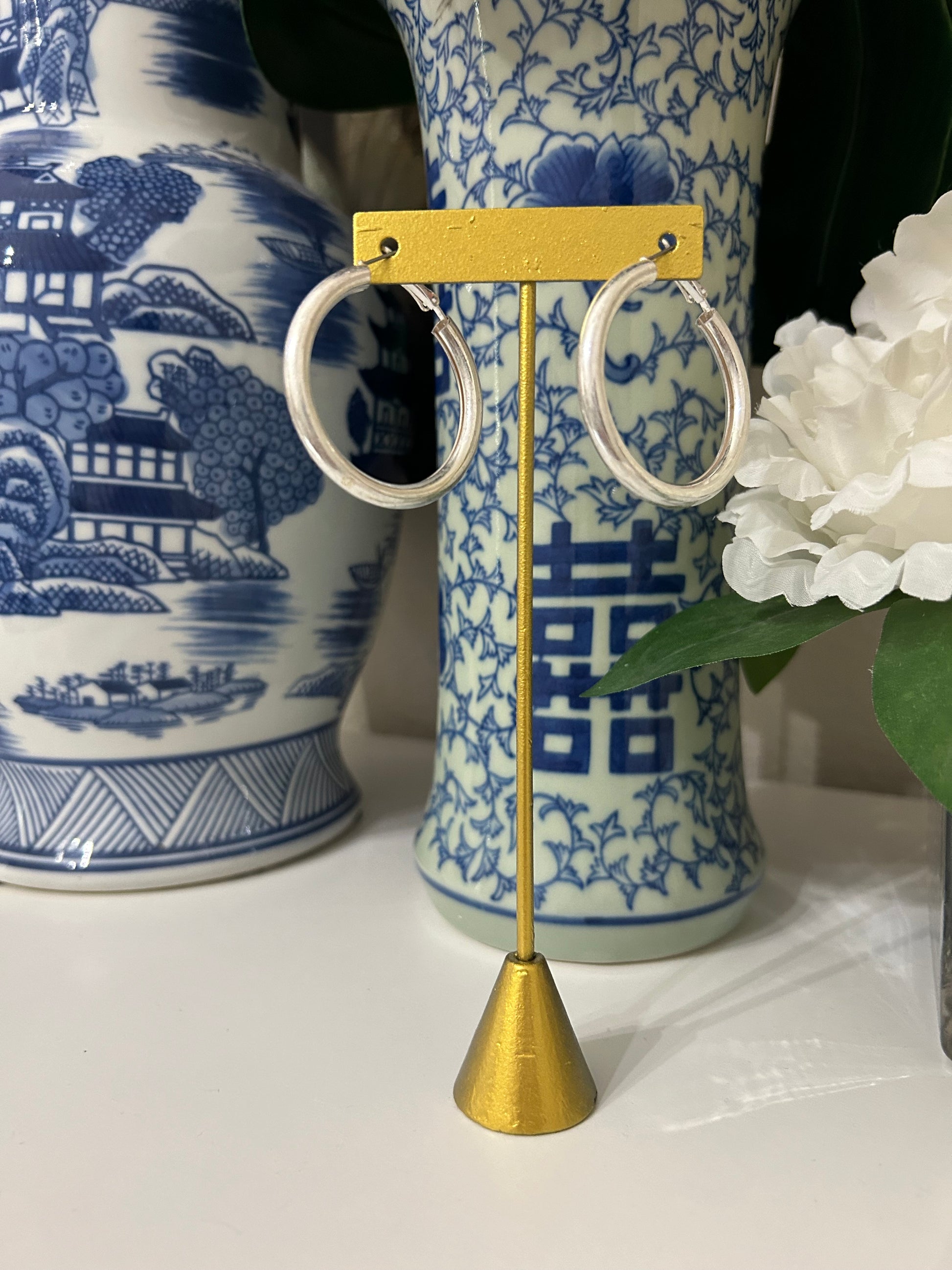 Elevate your look with these Brushed Silver Hoops, featuring a subtle worn finish that adds timeless elegance. Their lightweight design ensures comfortable all-day wear, making them a refined choice for both casual and formal occasions.