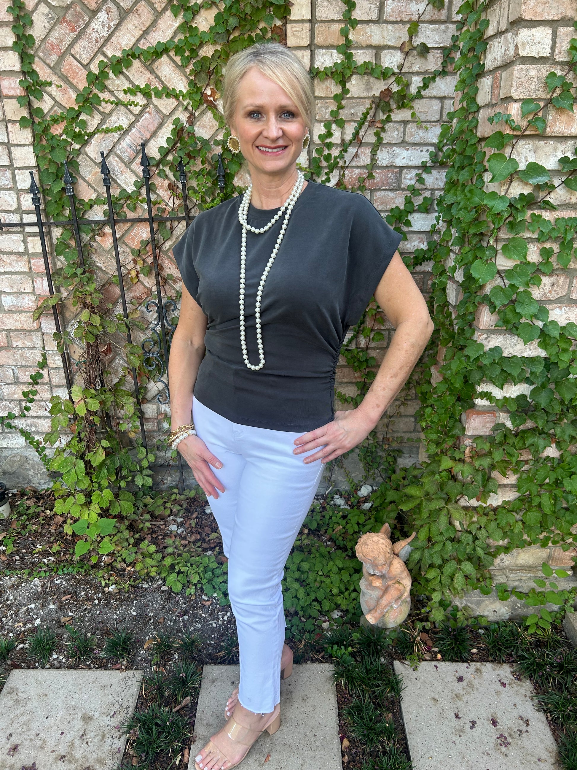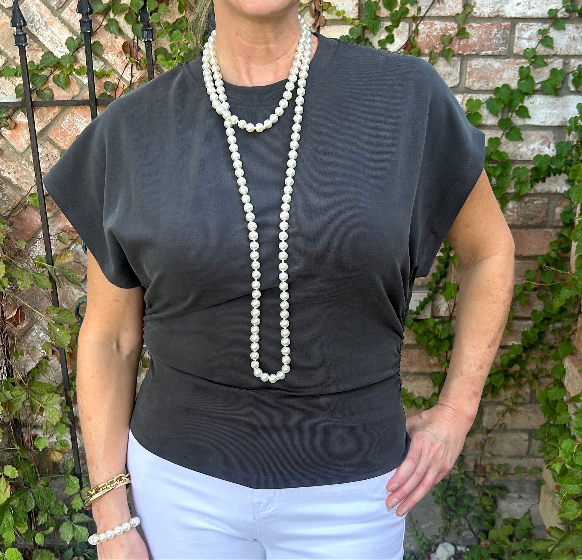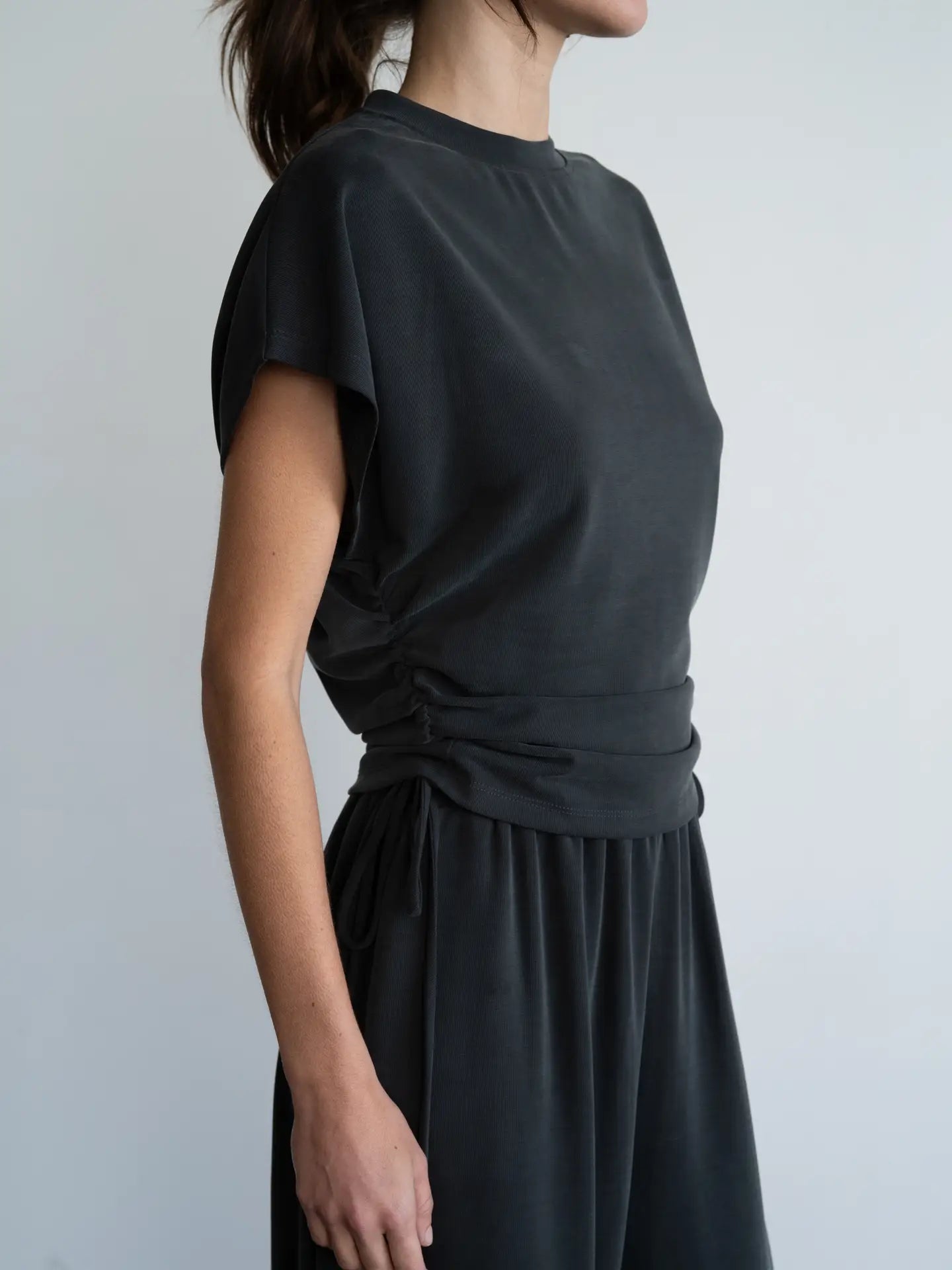 This playful short sleeve top, Carbon Crush, features soft fabric and charming rouching details that add a fun twist to your everyday look. Pair with shorts, pants or jeans.