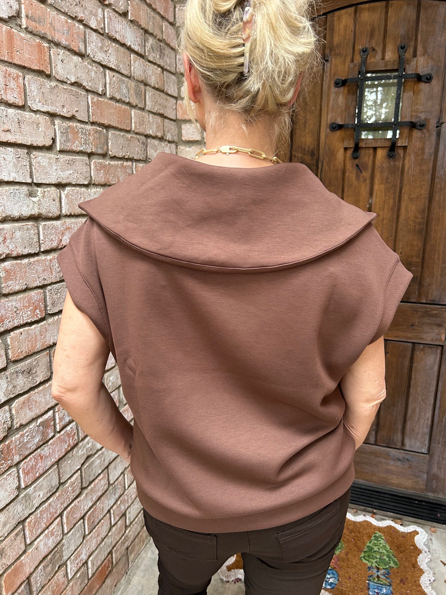 Cozy meets cool in this Chocolate Half Zip Scuba with short sleeves.