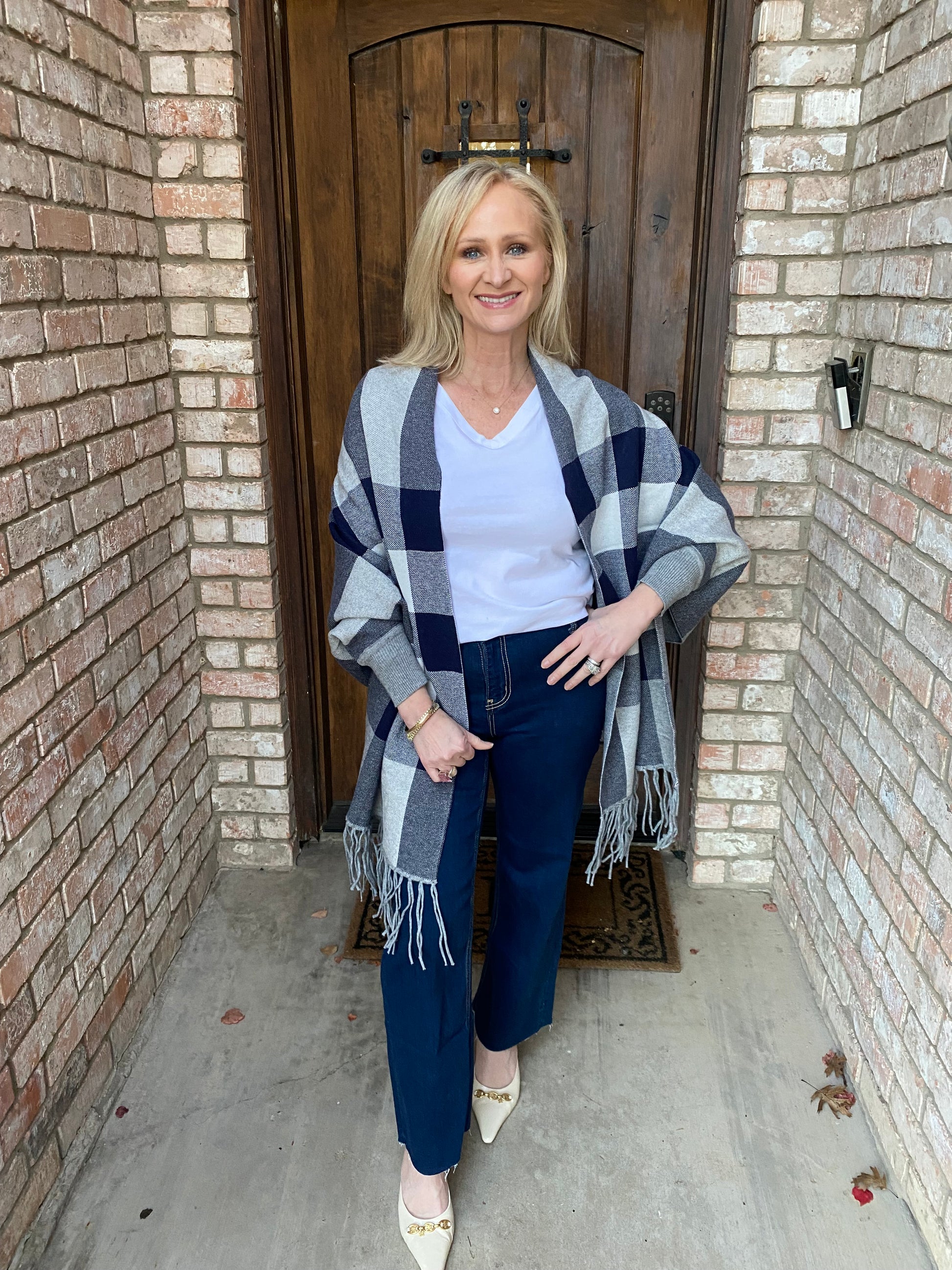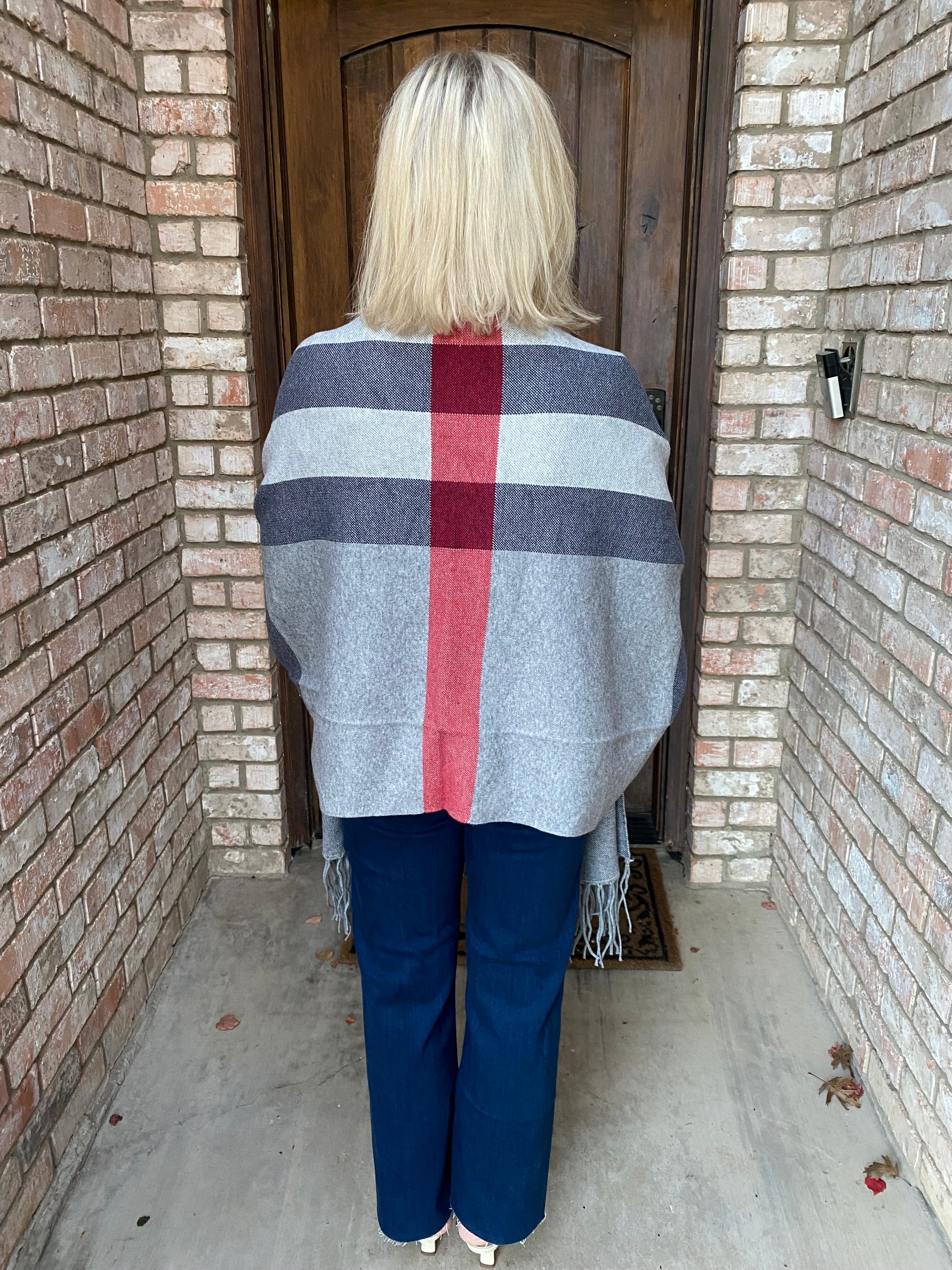 Wrap yourself in effortless elegance with this classic plaid shawl that doubles as a statement piece. Designed to slip on like a jacket, it's the perfect layer for any occasion—whether you're heading out or settling in at home. Crafted from sumptuous soft fabric, this Grey, blue and black plaid beauty features a stunning back design that turns heads from every angle. Style meets comfort in one versatile piece.