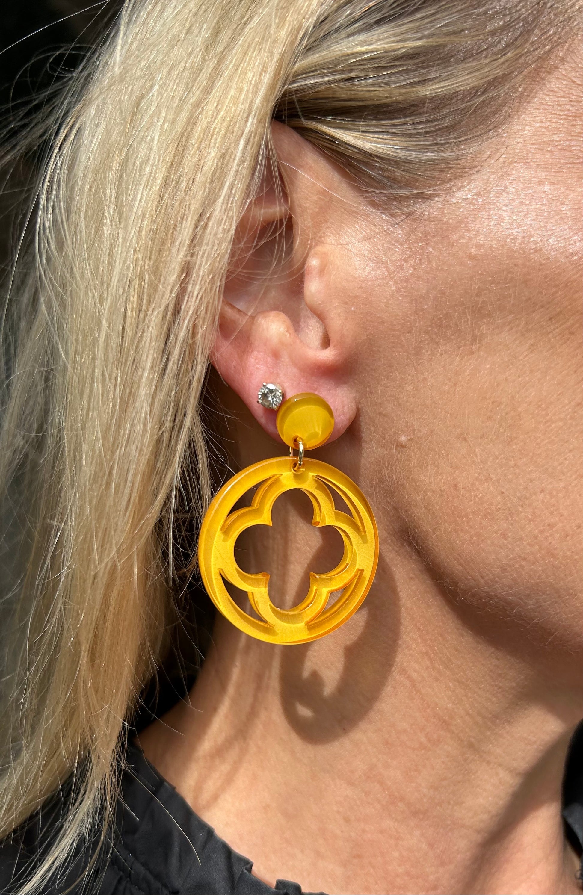 Elevate your style with the Clover Drop Earring in a gold neutral honey. Its elegant design adds a refined touch to any outfit, perfect for those seeking understated sophistication.