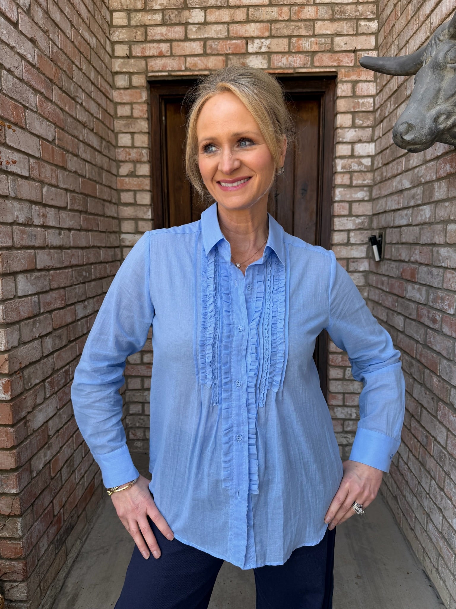 Soft, feminine, and effortlessly polished — this periwinkle blouse is the perfect piece for spring and summer. Crafted from 100% cotton, it’s lightweight, breathable, and beautifully made with top-quality fabric you can feel.