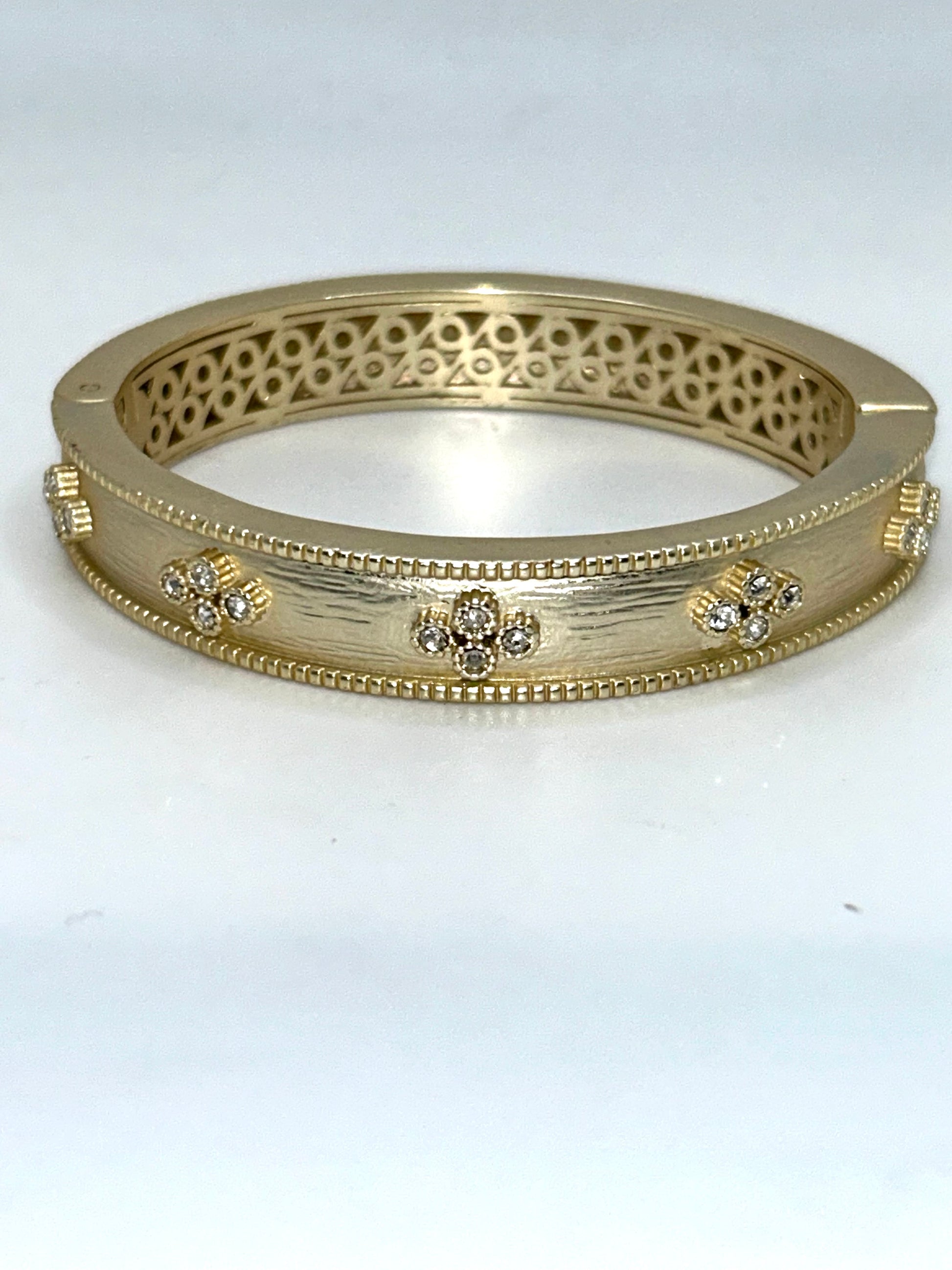 Elevate your style with the Diamond Cluster Brushed Gold Bangle, featuring a refined gold-plated matte finish. This stunning bracelet blends subtle luxury with timeless elegance, perfect for adding a sophisticated touch to any ensemble.