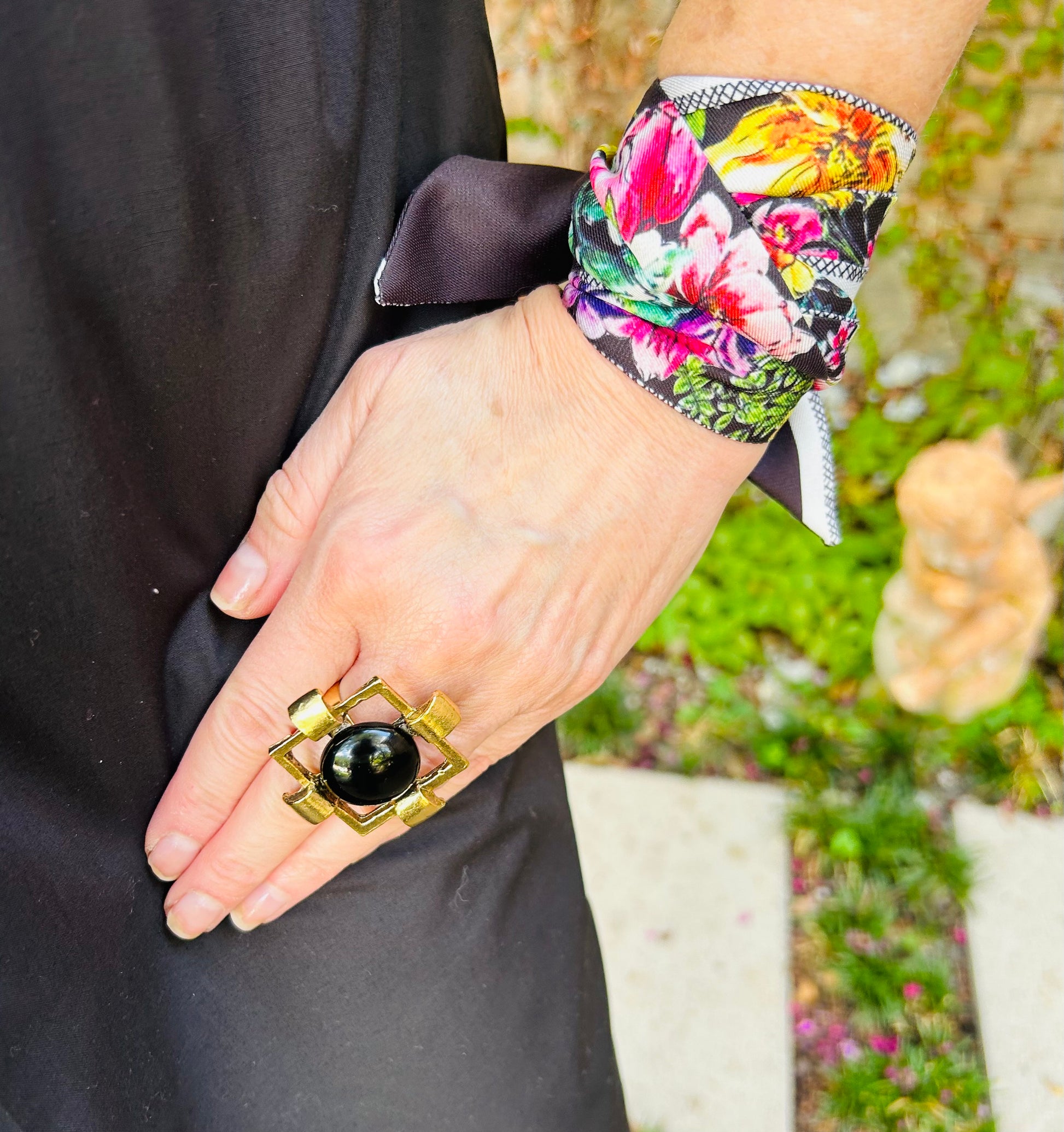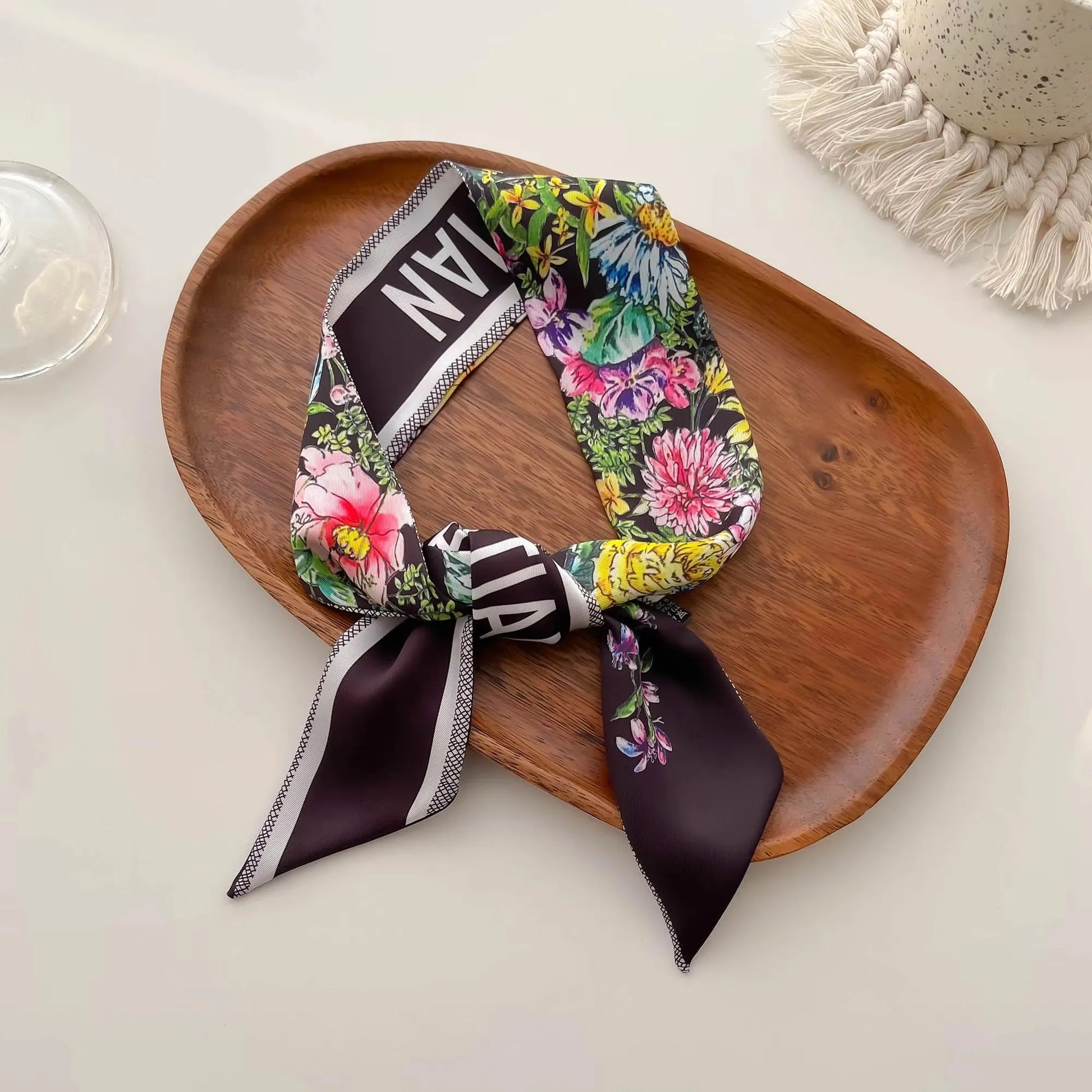 Elevate your ensemble with our versatile silk twilly. This sophisticated accessory features a designer inspired floral design with a black background. The reverse side is a simple black and white. Perfect as a belt accent, neck wrap, or handbag embellishment, it adds a refined touch to any outfit.