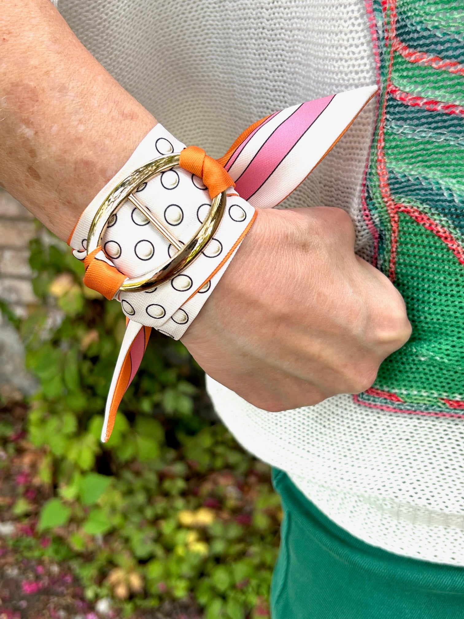 Add a playful touch to your look with the Gold Scarf Slide. Perfect for styling your twilly, scarf, or even knotting your blouse, this accessory is a must-have for effortless chic. Elevate your outfit with a simple twist of elegance!