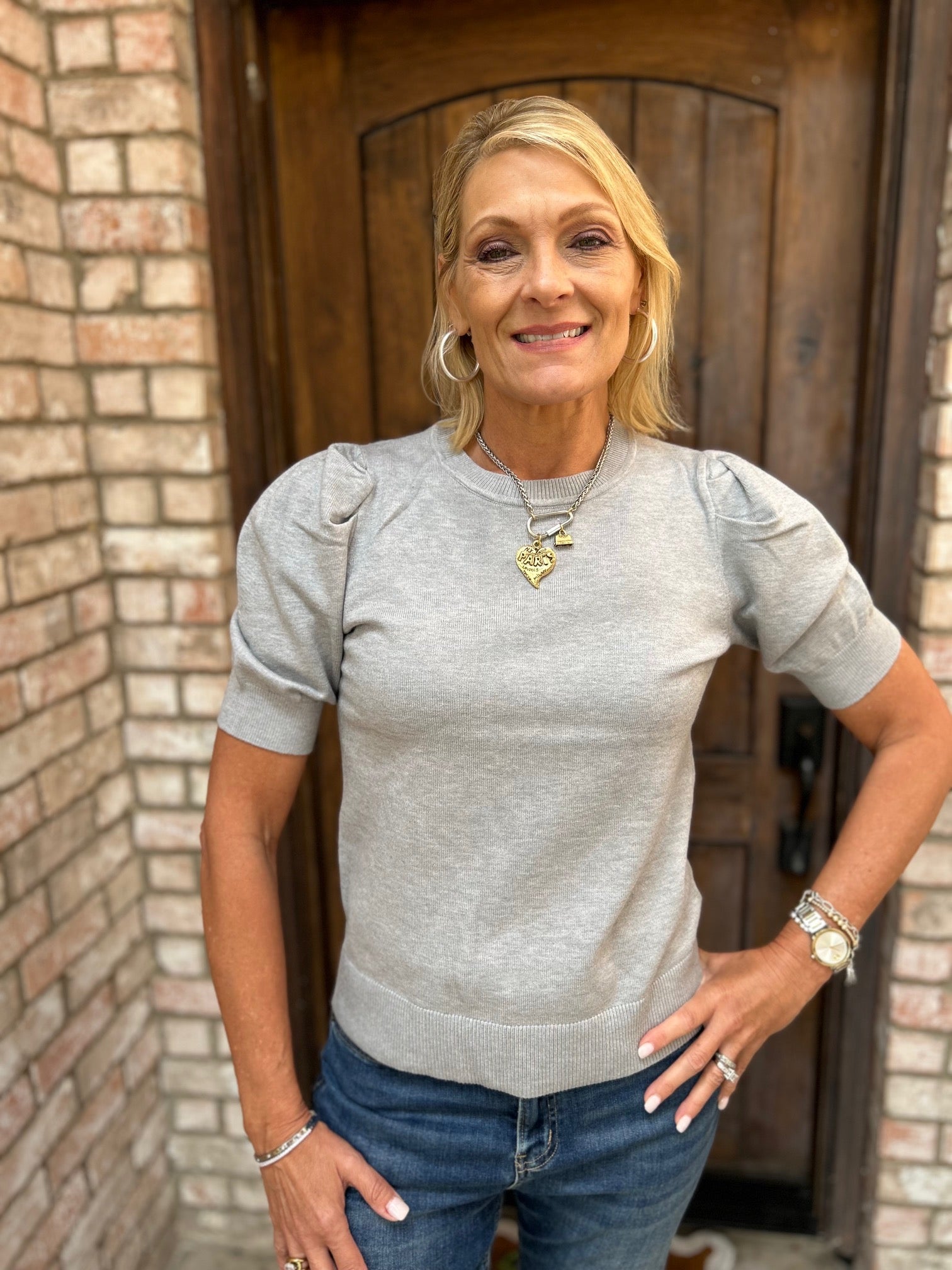 Cozy meets cool in this Grace Grey Sweater! With its classic crew neck and breezy short sleeves, it’s the perfect playful twist on a traditional sweater.