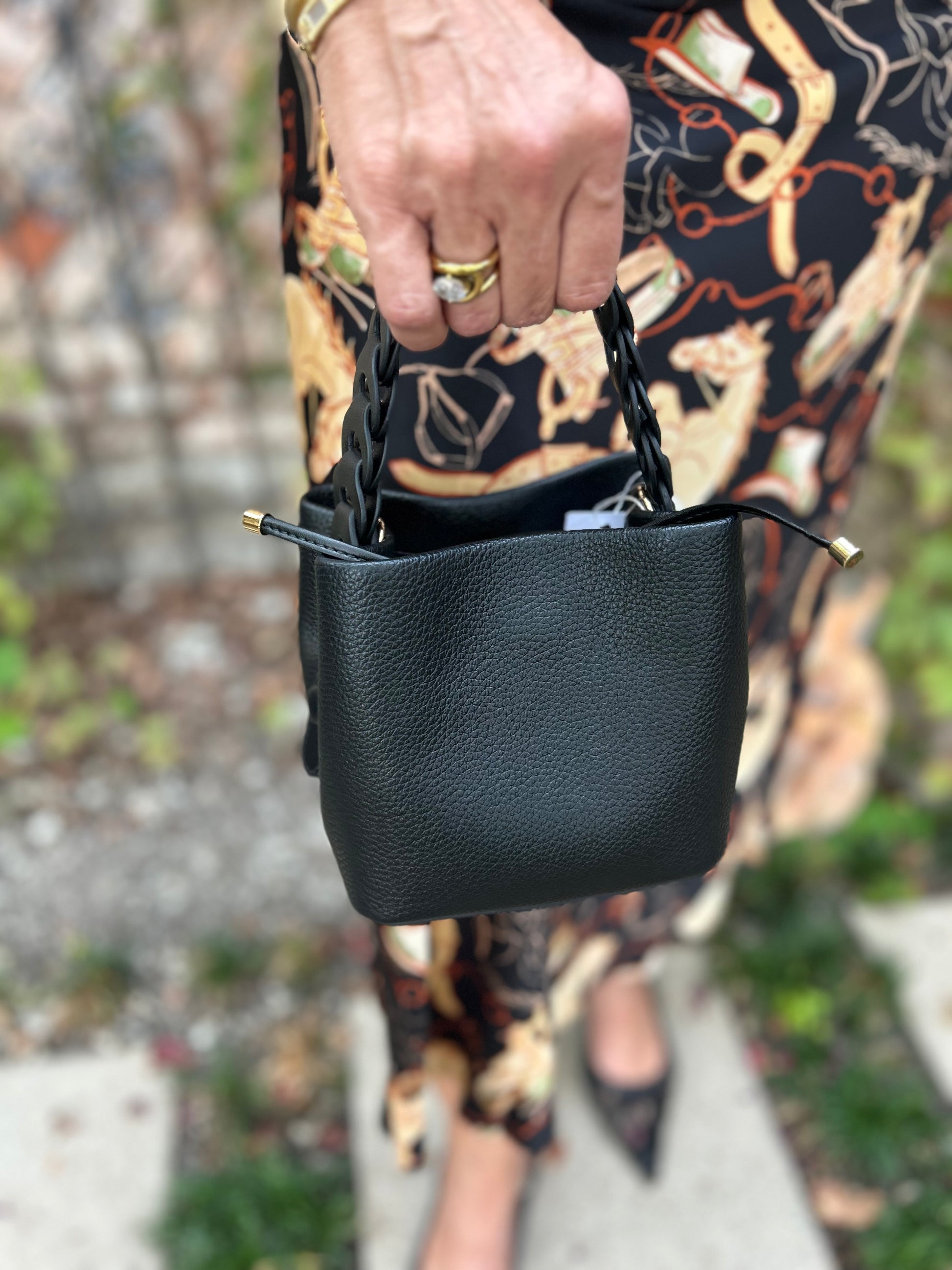Meet the Handle With Flair Bag—a chic black companion that keeps your essentials secure with an easy drawstring closure. Its standout handle, wrapped in a playful scarf accent, adds a splash of personality.