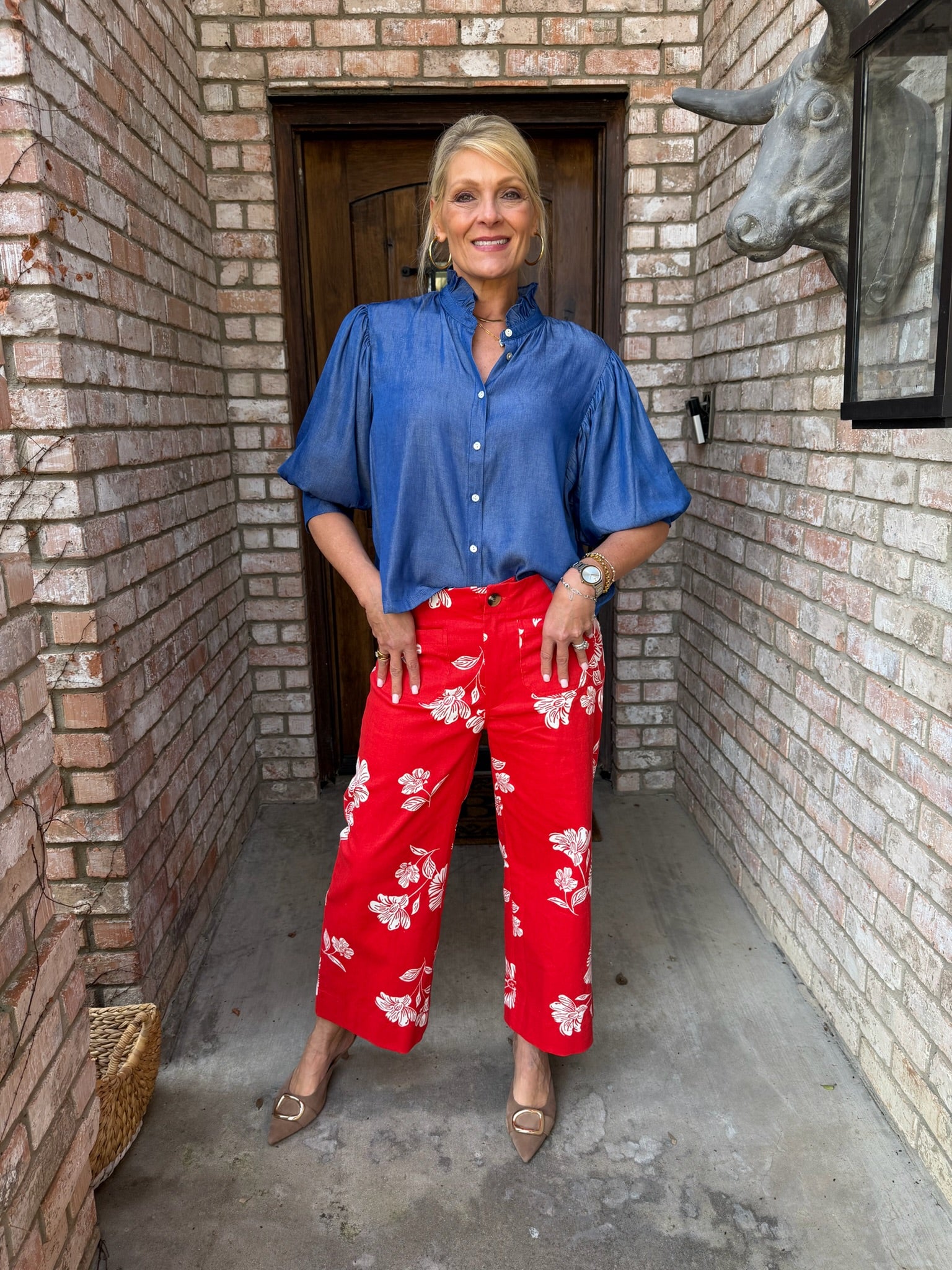 Add a touch of effortless charm with this indigo blouse, featuring a delicate faux ruffle collar.