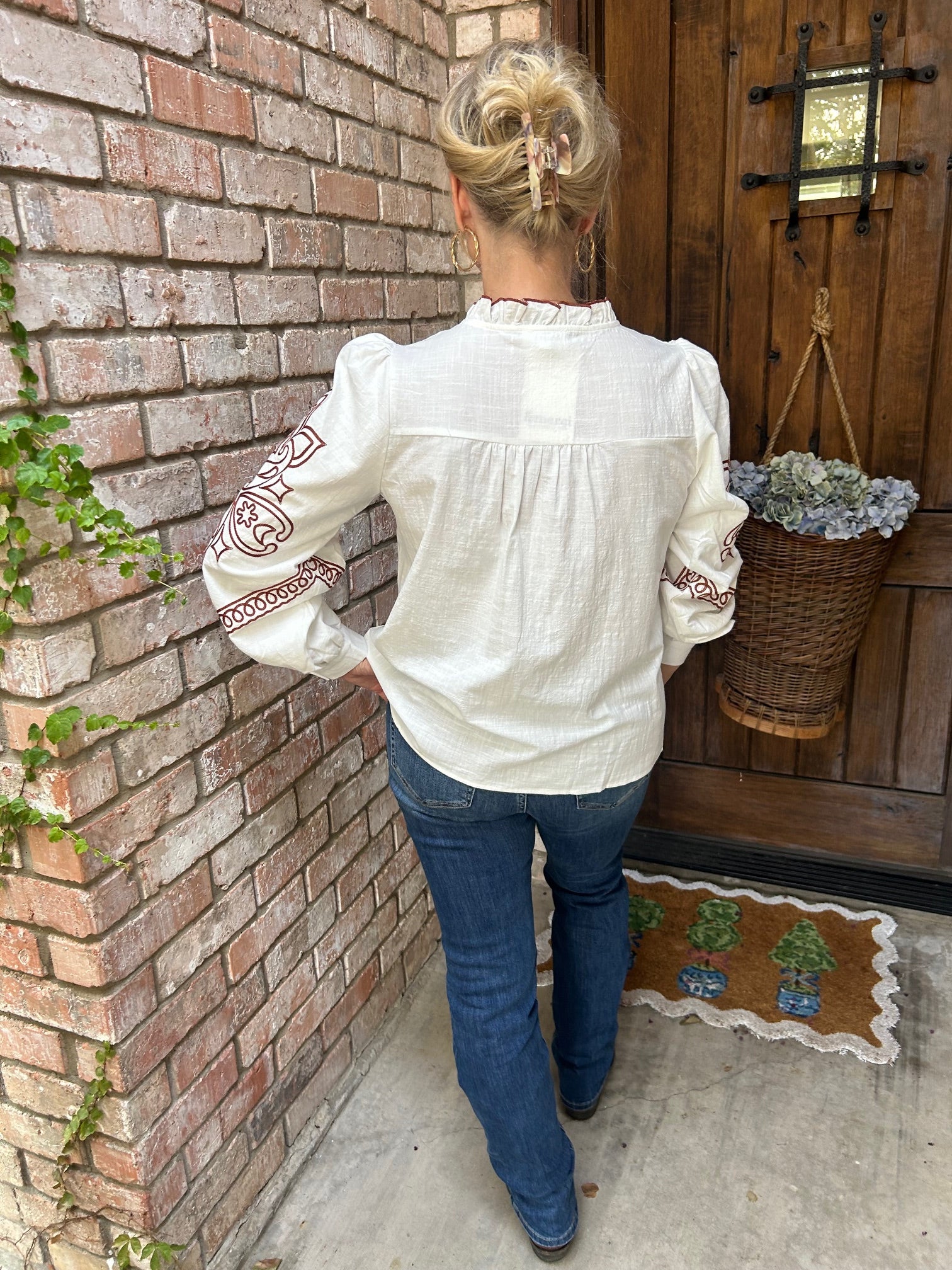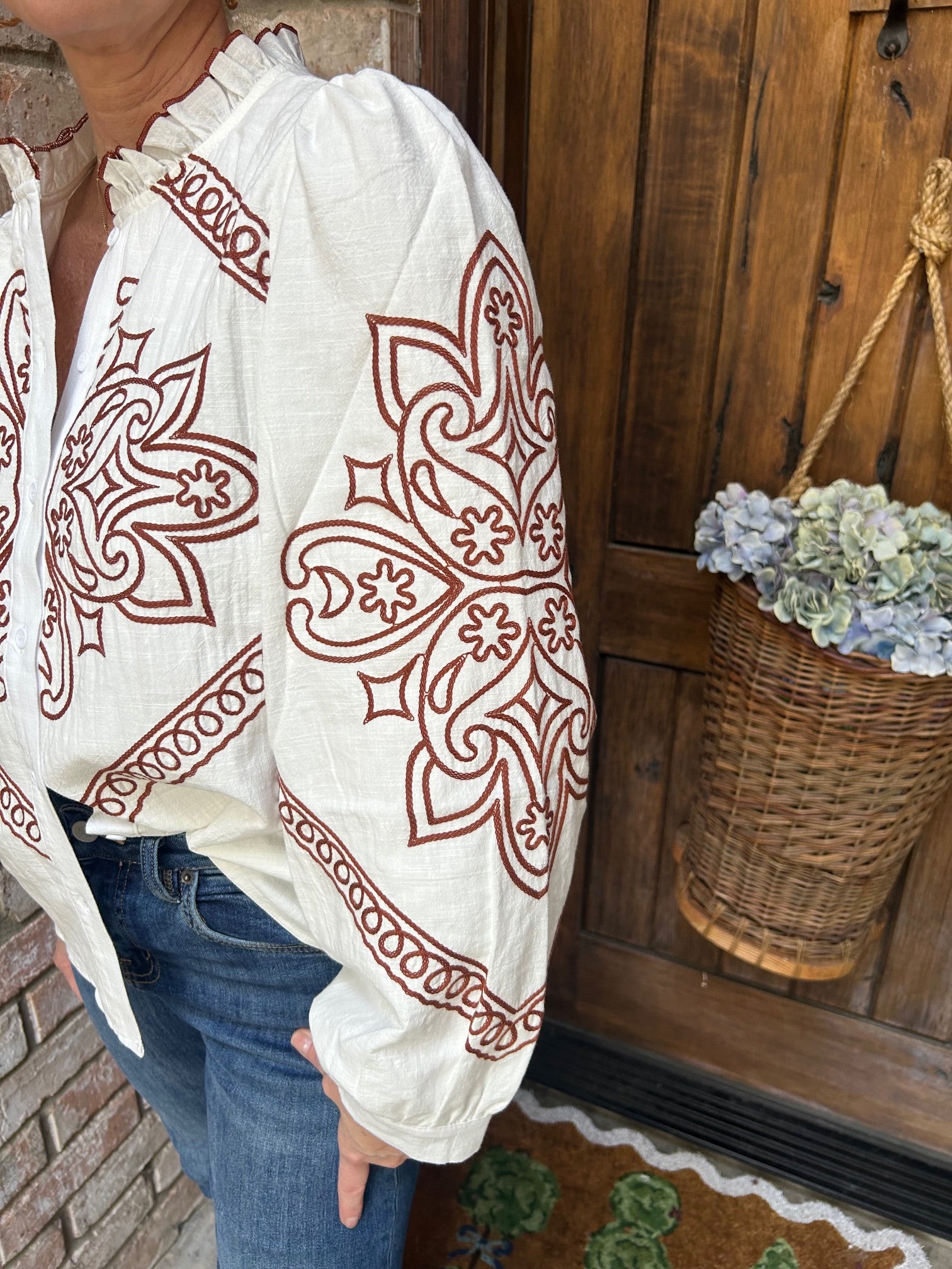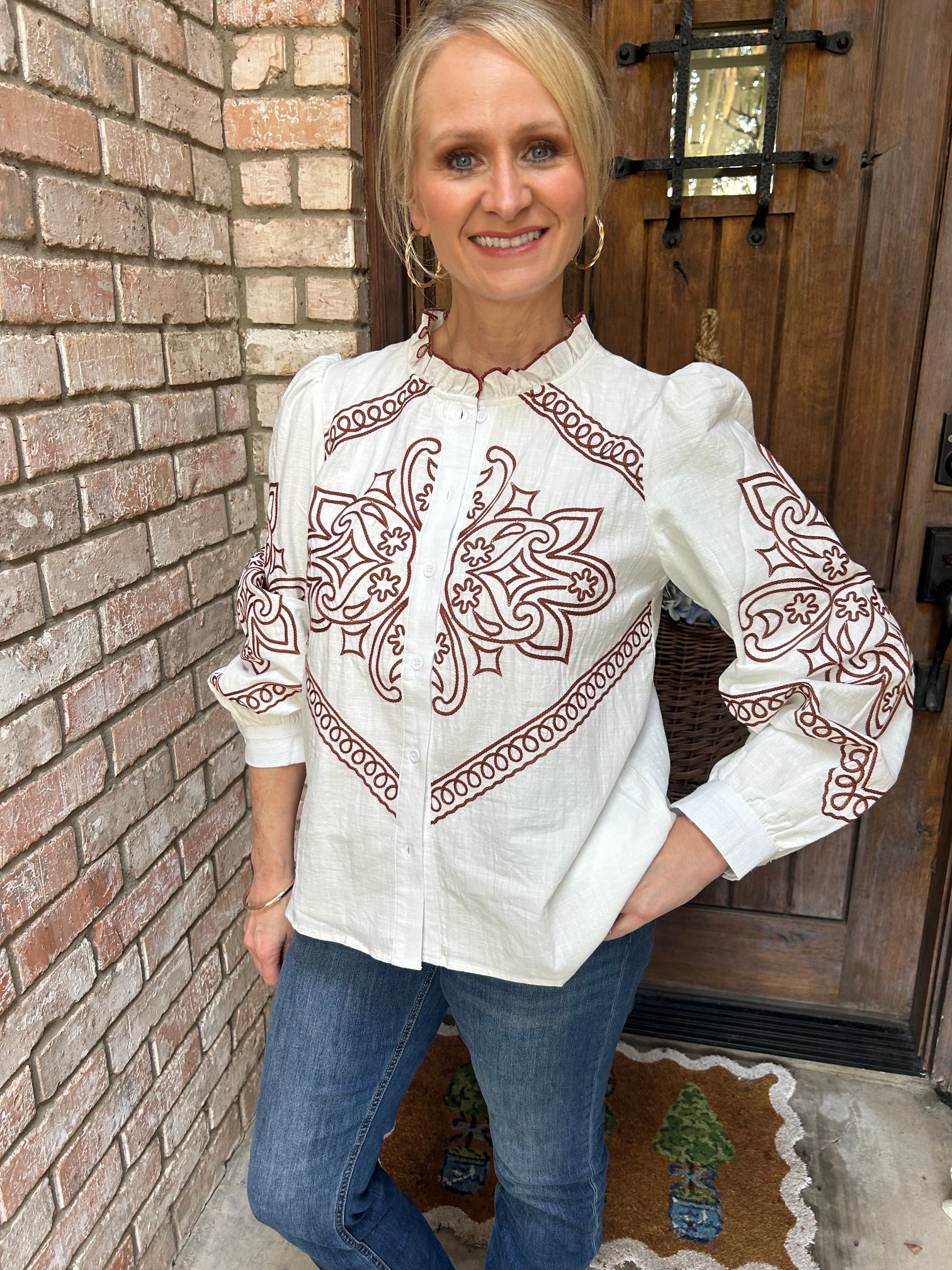 The Lainey Blouse is a charming white blouse accented with delicate brown stitching for a touch of feminine detail.