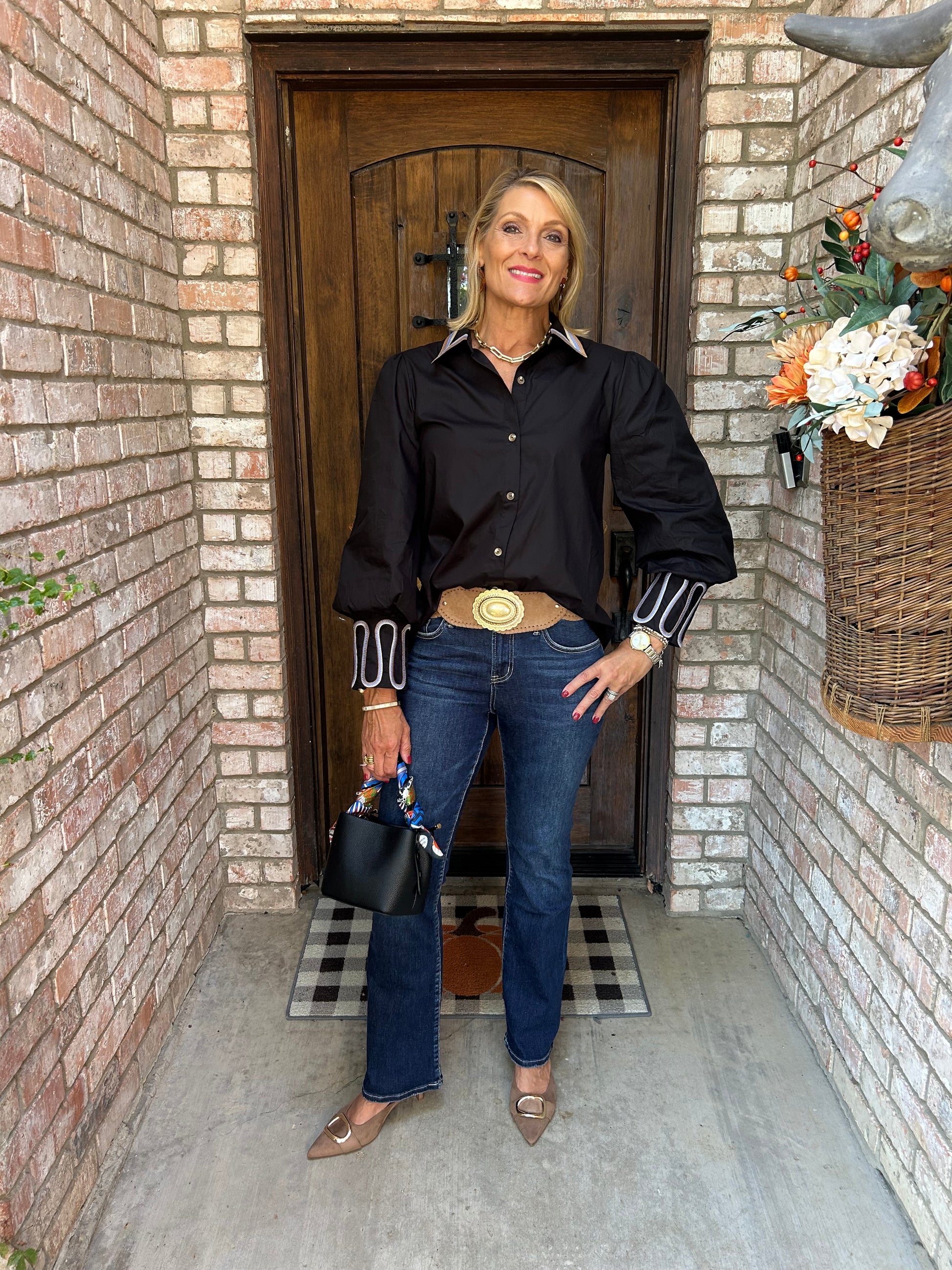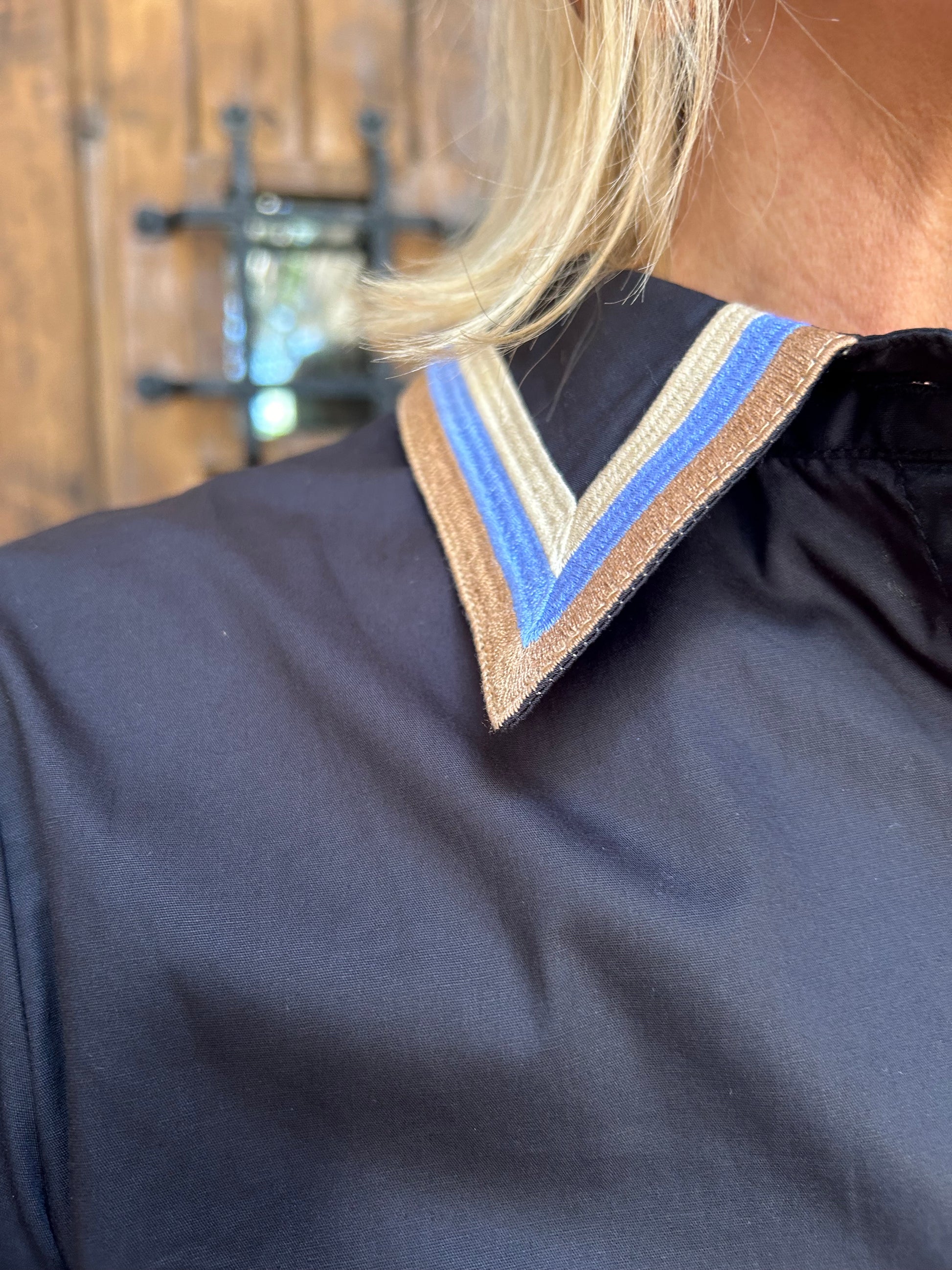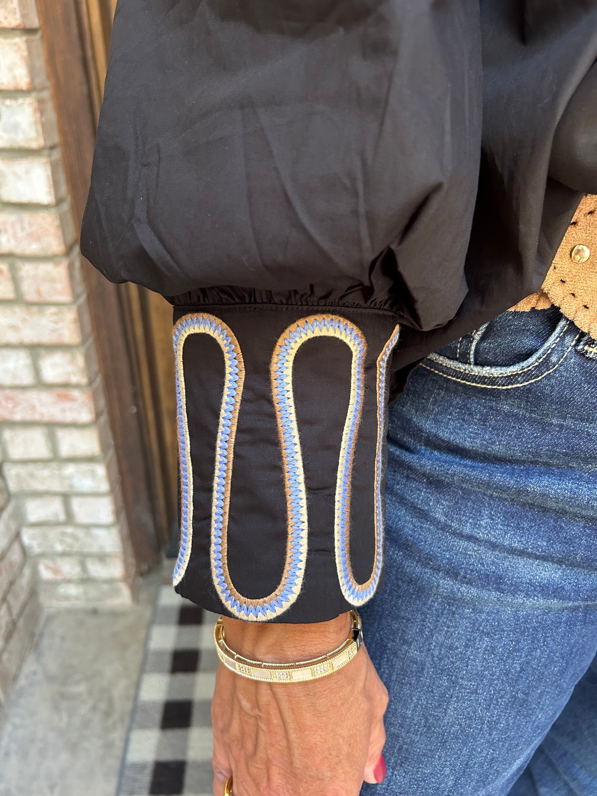 The Midnight Stitch blouse features a refined black fabric complemented by intricate, colorful embroidery on the collar and cuffs. This elegant detail adds a subtle yet striking touch, perfect for elevating your wardrobe with a sophisticated, timeless piece.