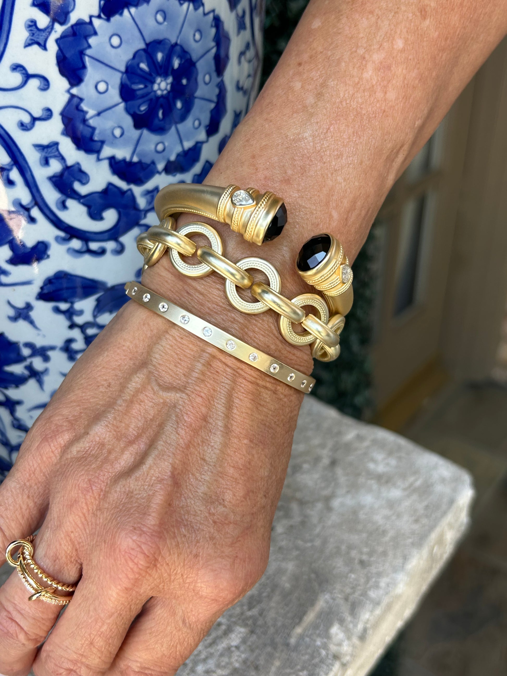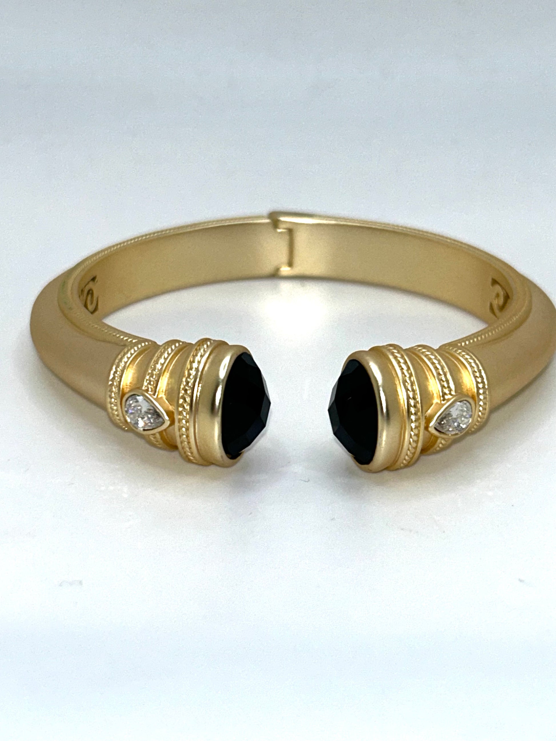 Add a touch of glam with this Noir Brushed Gold Large Hinged Bangle. Featuring a dazzling black faceted stone accented by sparkling CZ stone and delicate roping details.