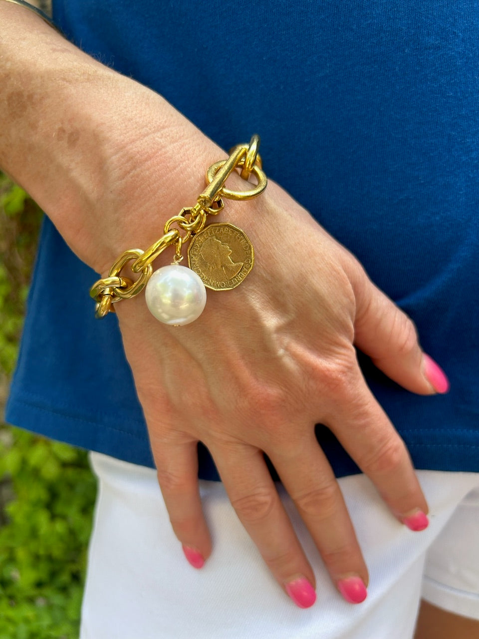 Exquisite gold link bracelet, featuring elegant pearl and coin pendants that bring a refined touch to any ensemble. Its timeless design seamlessly combines classic sophistication with subtle charm.