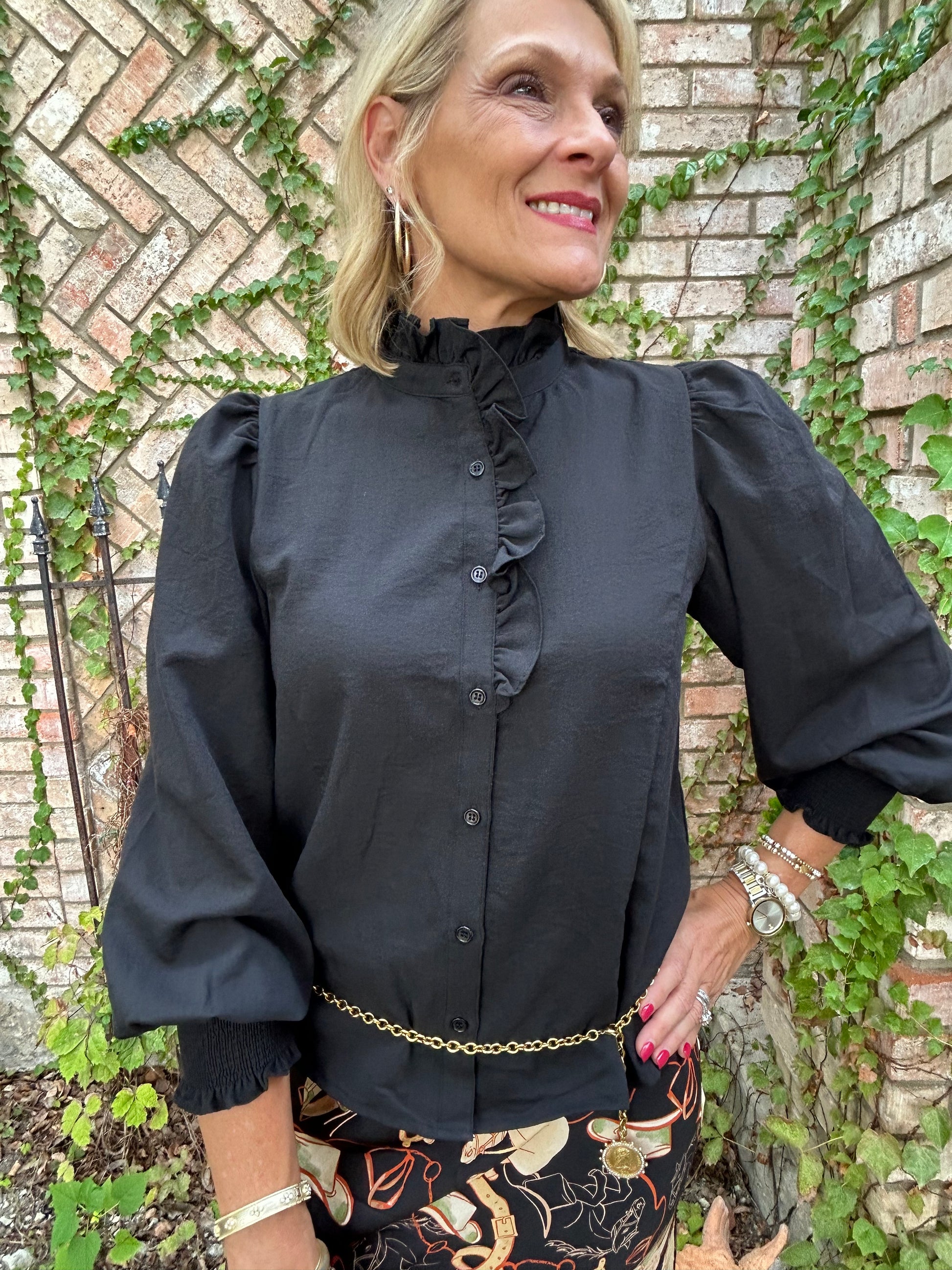 Add a flirty twist to your wardrobe with the Ruthie Ruffle Blouse. Its playful black fabric is complemented by a charming ruffle neck and long sleeves that bring a touch of whimsy to any outfit.