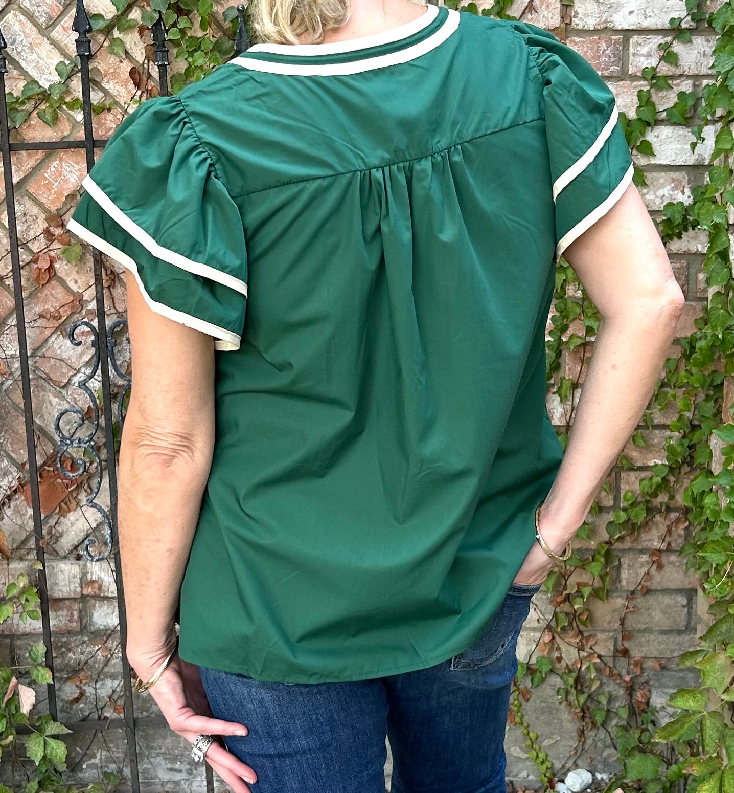 Add a splash of charm to your wardrobe with this Sage Flutter Blouse. Features whimsical flutter sleeves and delicate embroidery on the front, making every day feel a little more special.