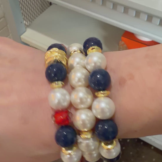The perfect blend of patriotic spirit with everyday style! The American Spirit Bracelet give you all the red, white and blue! A beautiful combination of red lampwork glass beads, navy jade beads and glass pearls with gold accents.
