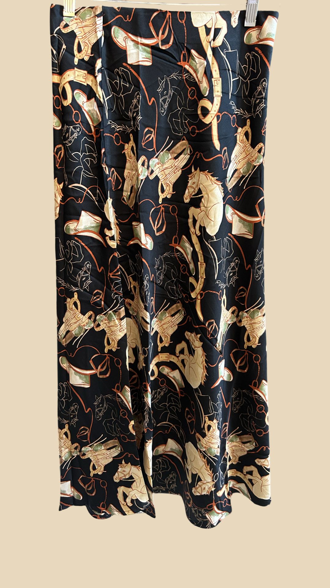 Step into style with the Silk and Saddle Skirt, featuring a charming equestrian pattern in bold black against warm rust and cream hues. This playful skirt brings a touch of countryside chic to your wardrobe while keeping you comfortable and effortlessly fashionable.