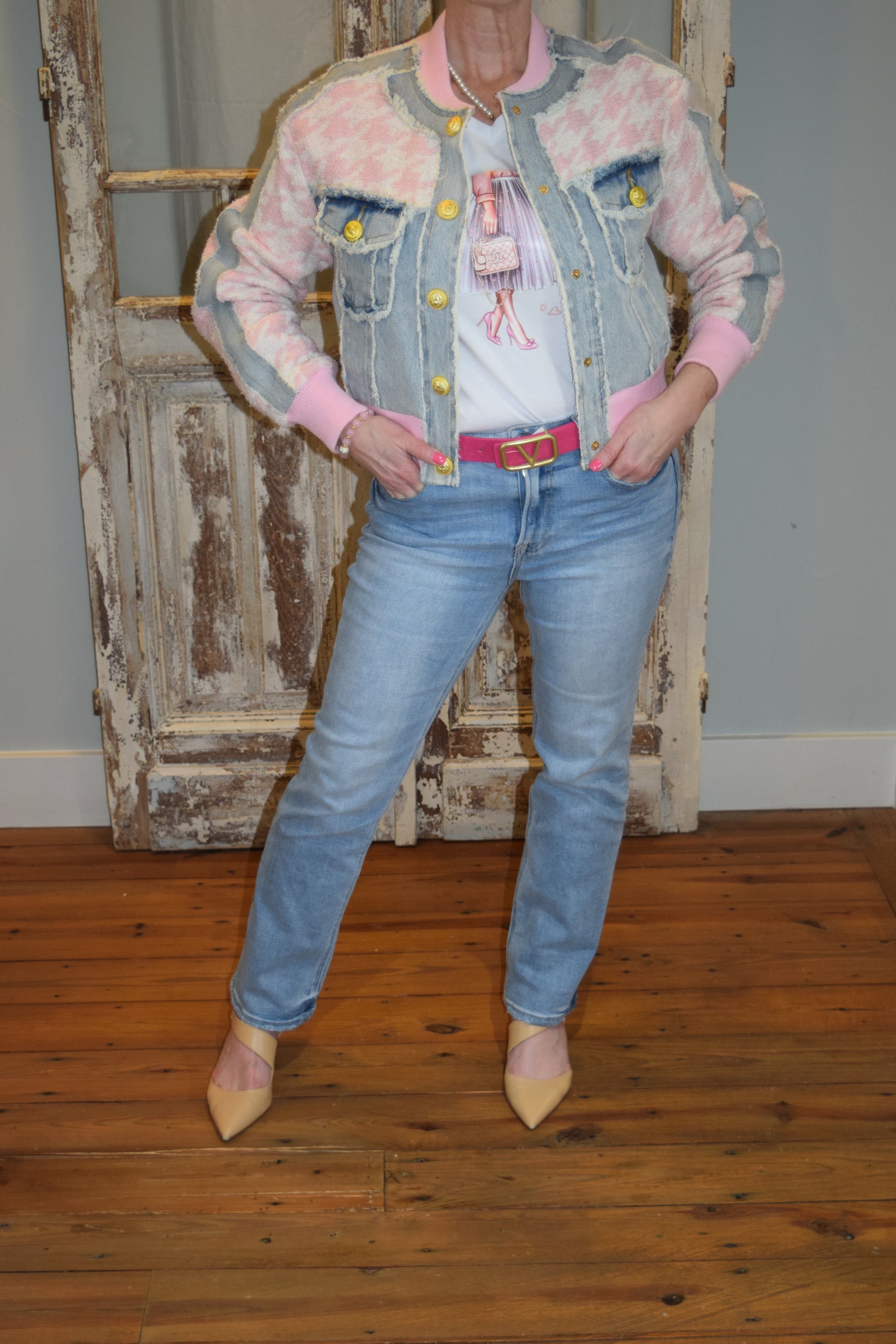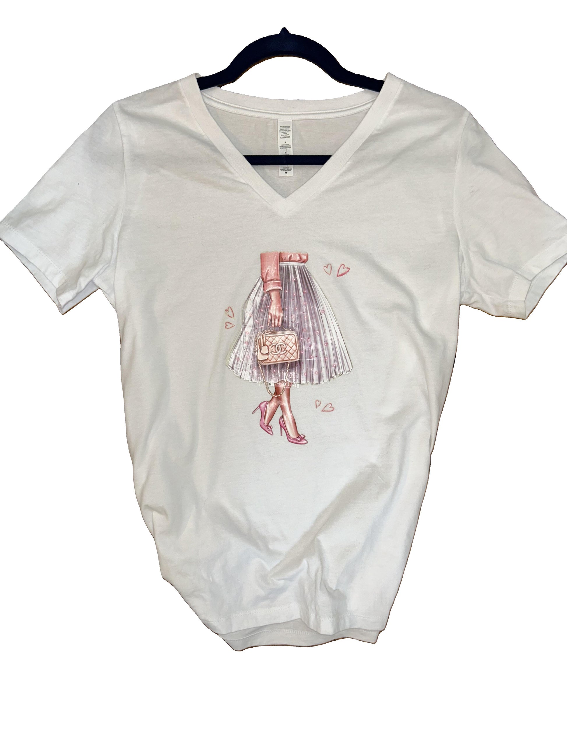 Add some flair to your wardrobe with this feminine and fun shirt. This soft white V-neck features a designer-inspired girl with a pink bag, giving you the perfect combination of comfort and style. You'll feel like a fashion icon every time you wear it. Don't be basic, stand out.