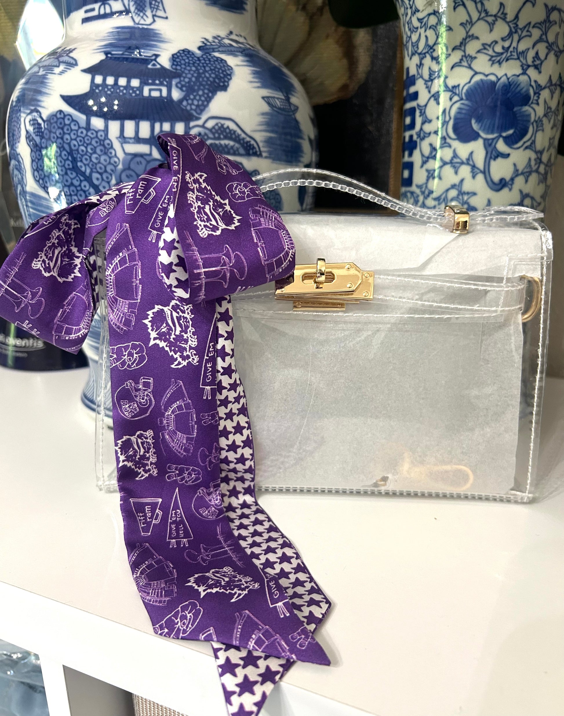 This sophisticated bag gives a nod to the iconic Kelly bag. Excellent for game day, concerts, shows, or any large stadium event.