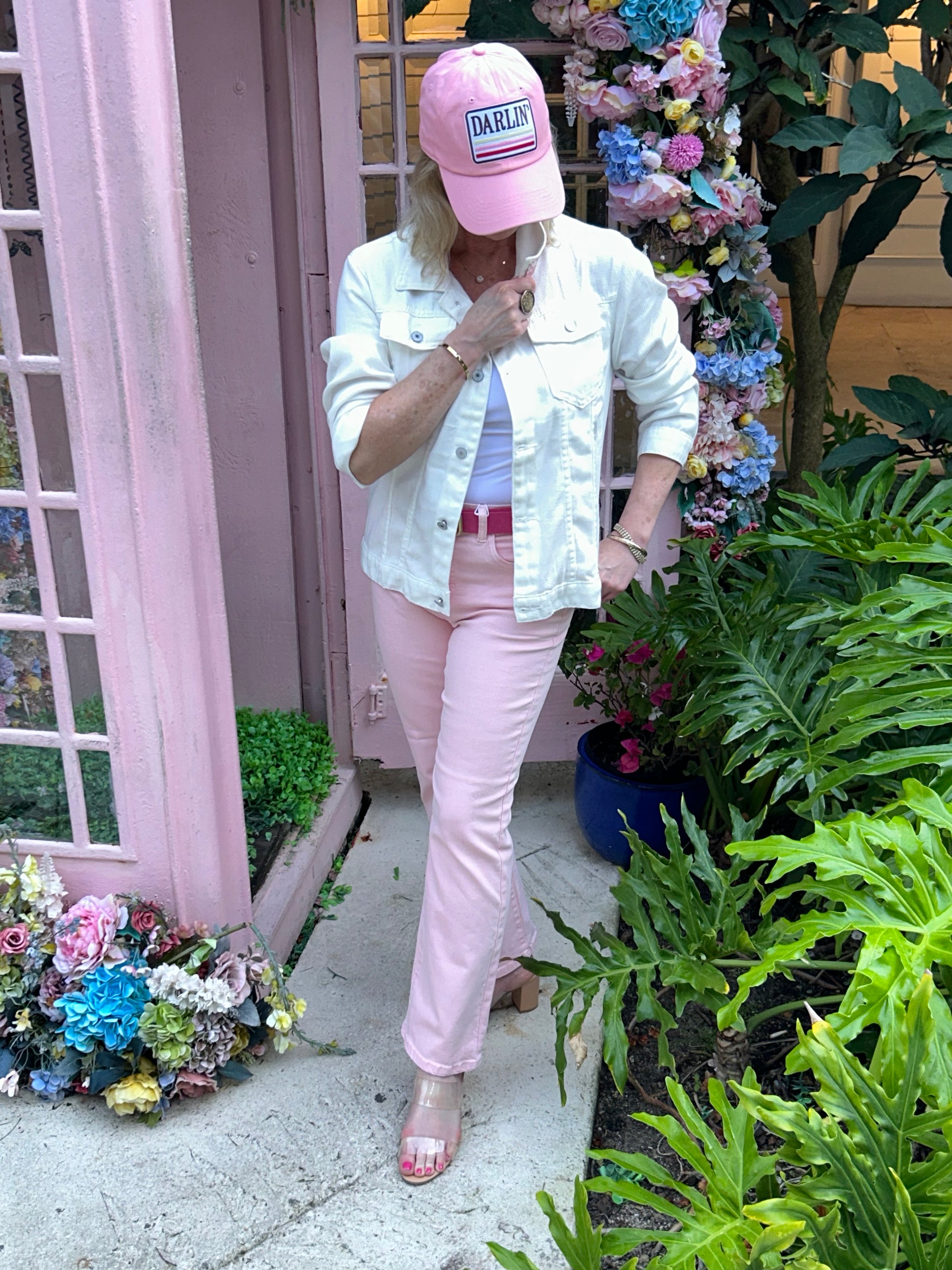 Add a touch of designer-inspired flair to your wardrobe with our Toile Scarf Jacket. This lightweight denim jacket boasts a stylish blush pink toile print and silk embellishments on the back and collar. Stand out in style with this unique and chic jacket.