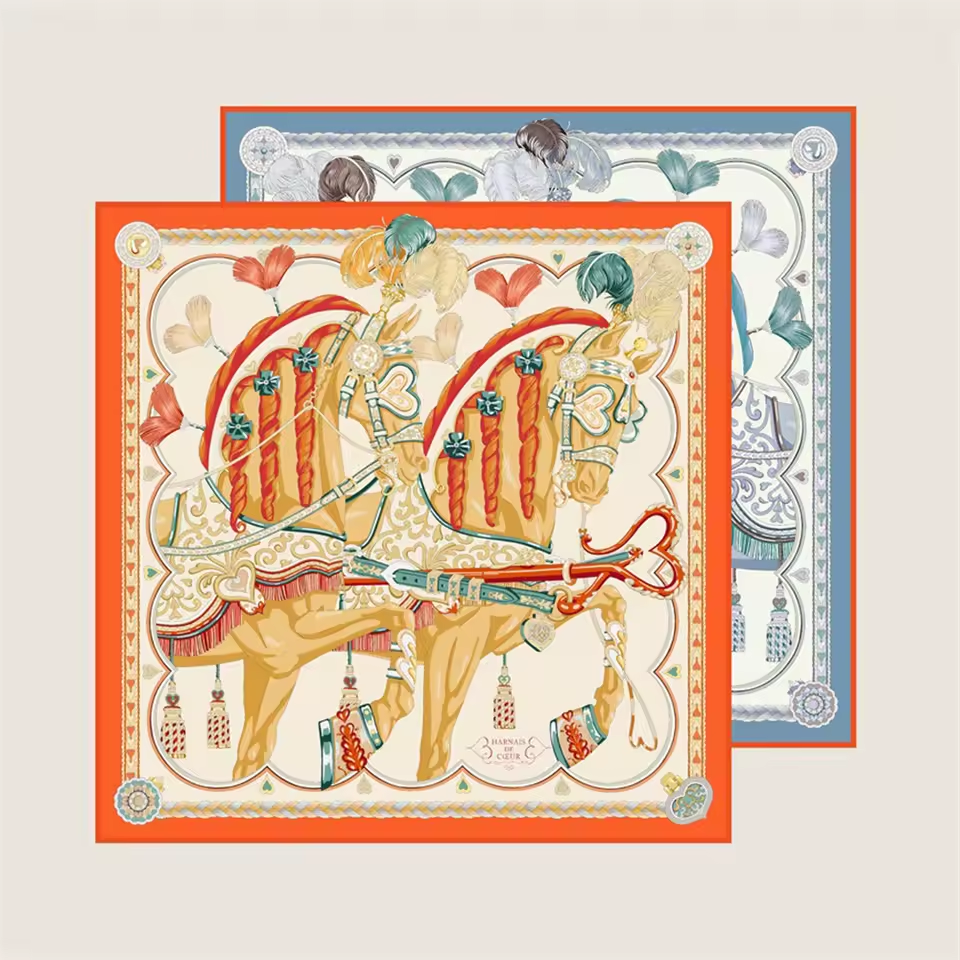 Wrap yourself in equestrian elegance with our Two-Sided Equestrian Scarf! This silky statement piece gallops between bold orange and aqua green, creating a playful pattern that's sure to turn heads. Perfect for adding a splash of personality to any outfit.