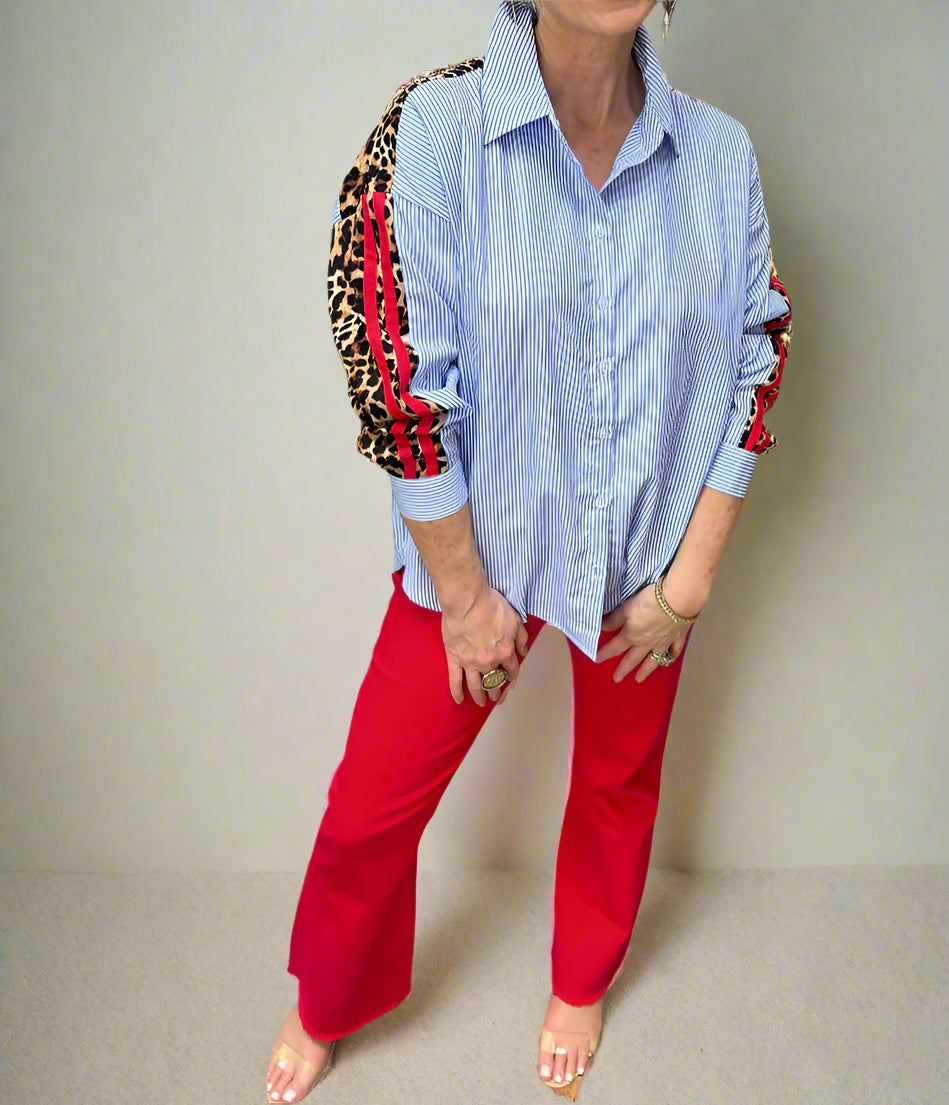 Playfully bold and effortlessly chic, the Wild Streak Blouse features timeless blue stripes paired with eye-catching red and leopard accents on the sleeve.